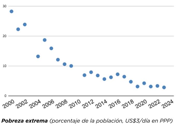 Entre 2005 y 2019 el PBI per cápita creció a un ritmo anual de 3,0%, con una inflación por debajo del 6% a partir de 2012. Usando la línea de pobreza extrema del Banco Mundial de US$3 por día, la pobreza cayó del 19% al 3%. Esto fue impulsado no solo por crecimiento agregado sino también por una fuerte redistribución de los ingresos, logrado por una combinación de políticas laborales, transferencias directas e inversión en infraestructura. La tasa de electrificación rural, por ejemplo, pasó del 33% en 2005 al 82% in 2021. La participación del 20% más pobre en el ingreso total subió del 2,0% al 5,1%, lo cual implicó que los ingresos de los más vulnerables más que se triplicaron—un aumento mucho más rápido que el promedio. Este cambio en la distribución fue necesario para el desarrollo en el largo plazo: Bolivia pasó de ser uno de los países más desiguales del mundo a tener un nivel de desigualdad moderado.