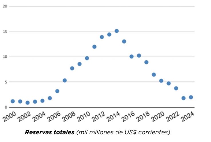 Esto se consiguió sin contradicciones macroeconómicas. Hasta 2014, las reservas crecieron fuertemente gracias a las exportaciones de gas. Pero a partir de 2015 cayó no solo el precio de gas internacional sino también la producción de gas, impulsando un déficit en la cuenta corriente que fue pagado mayormente por estas reservas, que fueron cayendo.