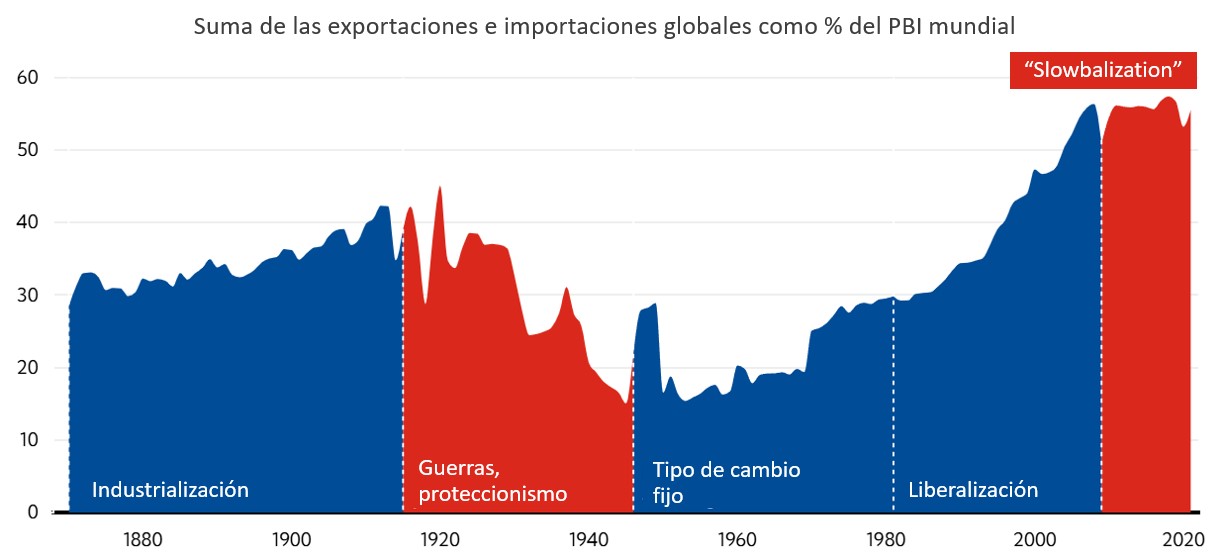 La crisis financiera de 2008 marcó un punto de inflexión. Desde entonces, la apertura comercial mundial se estabilizó en torno al 55% del PBI. El Fondo Monetario Internacional define este período como slowbalization: una globalización desacelerada, caracterizada por el aumento del proteccionismo, la crisis del multilateralismo y un entorno geopolítico cada vez más volátil.
